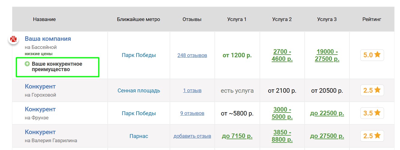 Если компания имеет конкурентные преимущества, мы можем их опубликовать на странице фитнес-центра и показывать в таблицах в соответствующих страницах. Преимущества можно гибко настраивать для разных услуг. Правильная публикация преимуществ существенно увеличивает интерес клиентов, так как выделяет фитнес-центр в таблицах и показывает, почему следует обратиться именно туда.