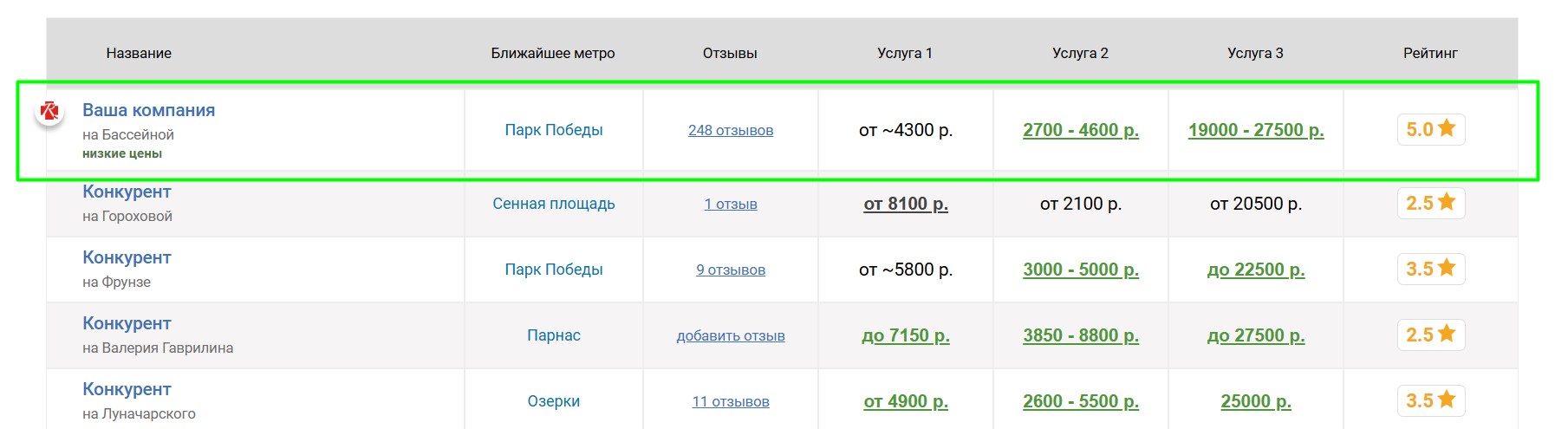 Вокруг продвигаемого таким образом фитнес-центра выбирается некоторое количество ближайших конкурирующих фитнес-центров, продвигаемый фитнес-центр попадёт к ним в таблицу «Сравнение по ценам», которая выглядит следующим образом: